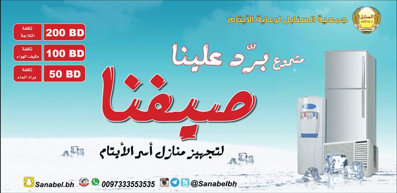 وتقدم الشيخ عدنان بخالص شكره وتقديره لكل من يساهم من أهل الخير والمحسنين لدعمهم مشروع ” برّد علينا صيفنا ” وبقية مشاريع السنابل لصالح أيتام البحرين، لافتا إلى أن هذه التبرعات والمساهمات تصب في ميزان حسناتهم ويجزيهم الله عن هذا العمل الخيري الإنساني خير الجزاء وسيخفف الله عنهم كرباتهم وسيزيل همومهم بإذنه تعالى كما خففوا عن أبنائهم الأيتام.