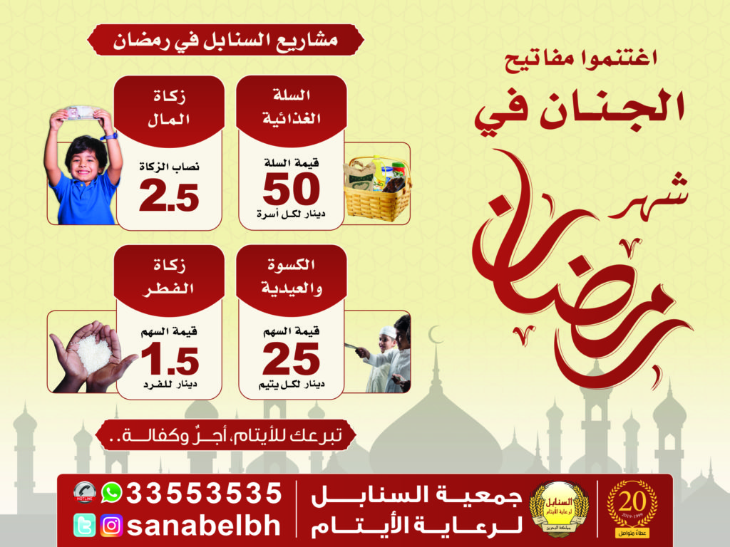 حيث تنفذ السنابل عدداً من المشاريع التي تستهدف مساعدة أسر الأيتام خلال الشهر الفضيل ومنها توفير المواد الغذائية لأسر الأيتام عبر مشروع السلة الغذائية الرمضانية والتي يبلغ مقدار المساهمة فيها 50 ديناراً، كما يتم صرف مبالغ نقدية للأسر عبر توزيع مبالغ الزكاة التي يتم إستلامها من المتبرعين الكرام، إضافة لصرف مبالغ المساعدة النقدية لمشروع الكسوة والعيدية لجميع الأيتام المكفولين قبل العيد بمبلغ 25 دينار لكل يتيم، وتختتم مشاريع رمضان بتوزيع زكاة الفطر ليلة العيد على الأسر الأكثر إستحقاقاً من التبرعات العينية التي يتم التبرع بها من قبل المتبرعين.