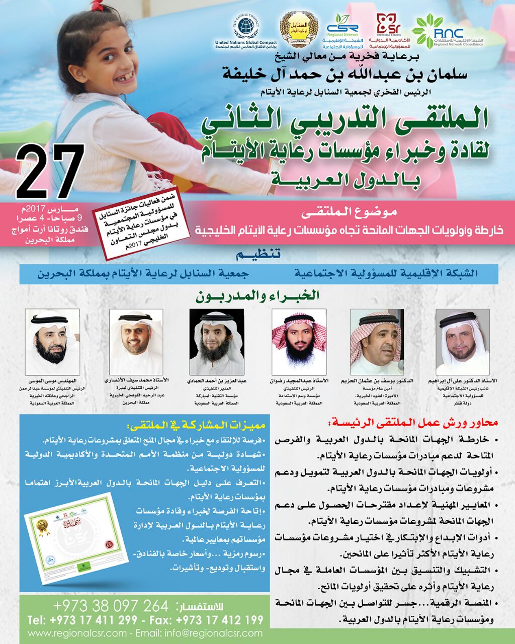 تنظم جمعية السنابل لرعاية الأيتام الملتقى التدريبي الثاني لقادة وخبراء مؤسسات رعاية الأيتام بالدول العربية 2017م ، وذلك صباح يوم الإثنين الموافق 27 مارس 2017م، بفندق روتانا أمواج بمملكة البحرين بالتزامن مع تنظيم الجمعية لحفل جائزة السنابل للمسئولية المجتمعية في مؤسسات رعاية الأيتام بدول مجلس التعاون الخليجي 2017م.
